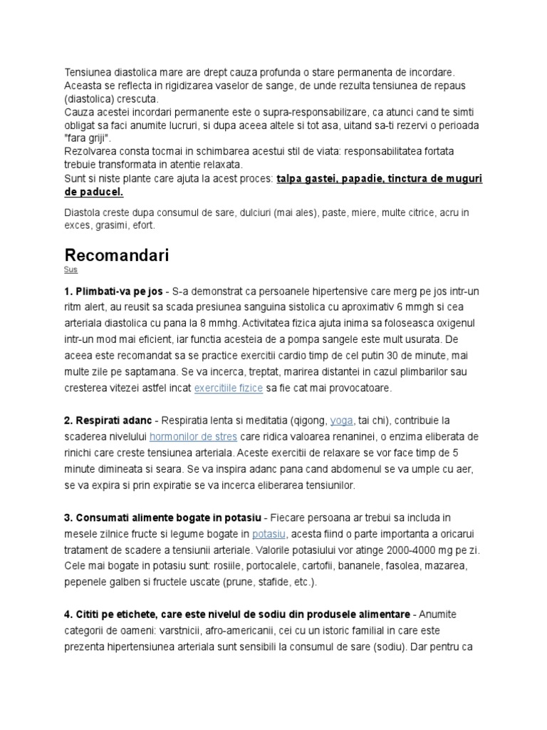 In timpul exercitiului fizic, tensiunea arteriala creste putin dar apoi scade mai mult decat daca ai fi sedentar si poate ramane la un nivel mai jos exista o serie de medicamente care scad tensiunea arteriala actionand asupra nivelului de sodiu, incetinind ritmul cardiac si relaxand vasele de sange.
