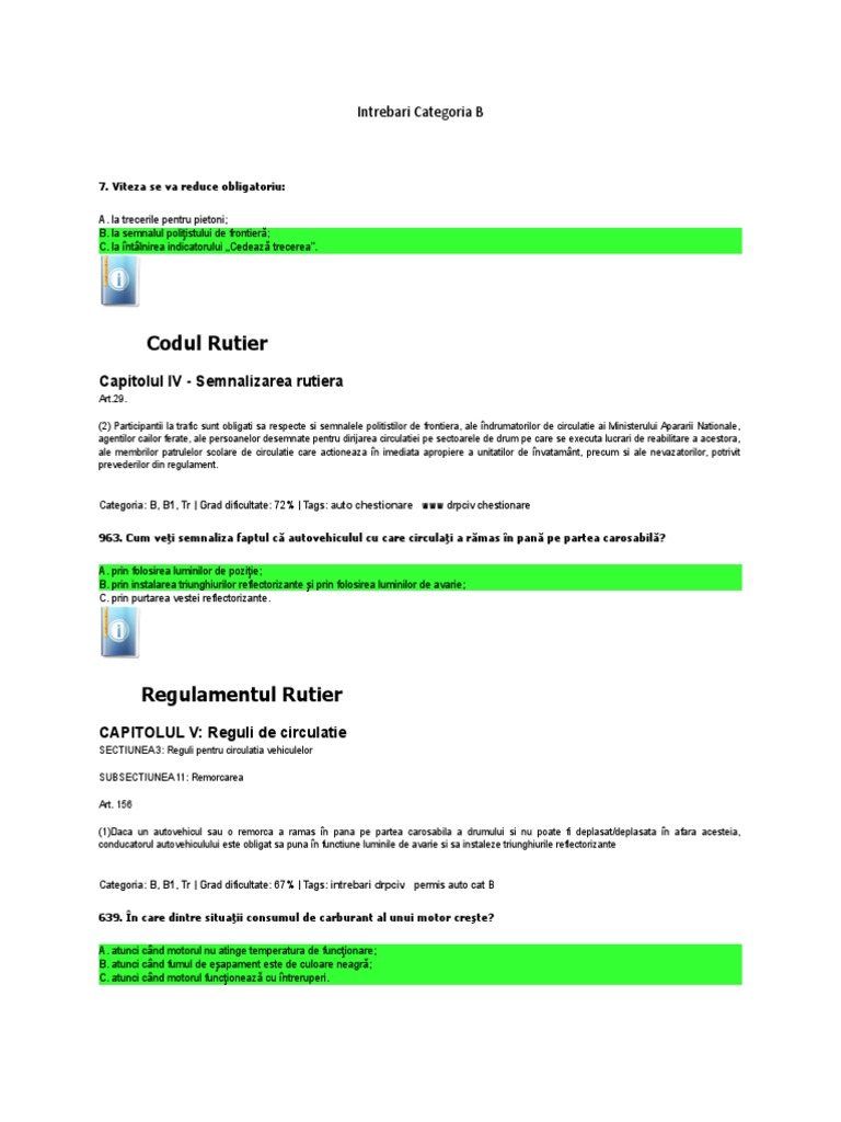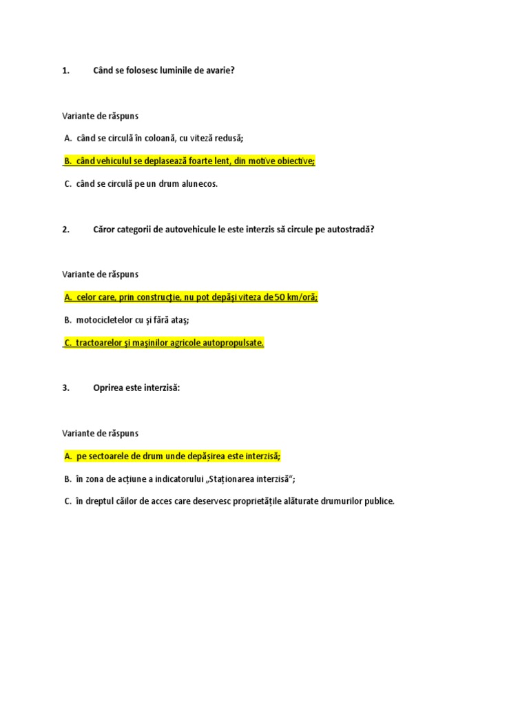 vizitati articolul complet aici : http://soferiteste.ro/TESTE/CATEGORIA_B/PRESELECTIA_B/preselectia_B1.htm Să circulaţi numai pe banda de lângă axul drumului, semnalizând cu luminile de avarie c. Pentru a răspunde la o întrebare trebuie să ai cont pe tpu.ro. • observarea cu întârziere a indicatoarelor;