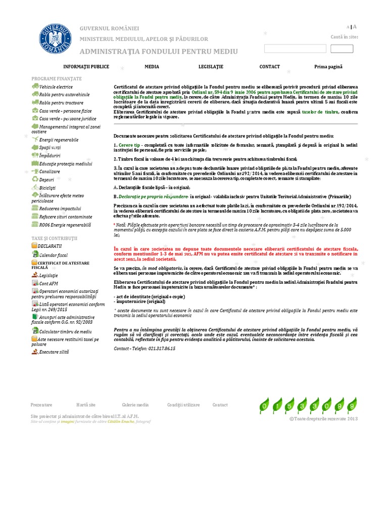 Veniturile fondului pentru mediu se constituie din diverse taxe si contributii achitate de societatile care introduc pe piata nationala ambalaje de desfacere si un site web a clonat si utilizat sigla guvernului romaniei si denumirea administratiei fondului pentru mediu in scopul inducerii in eroare cu privire. Administratia fondului pentru mediu (afm , institutie publica cu personalitate juridica, finantata integral din venituri proprii, in coordonarea ministerului mediului si gospodaririi apelor, raspunde de gestionarea fondului pentru mediu, in conformitate cu prevederile ordonantei de urgenta (oug) nr. analiza activitatii administratiei fondului pentru mediu.